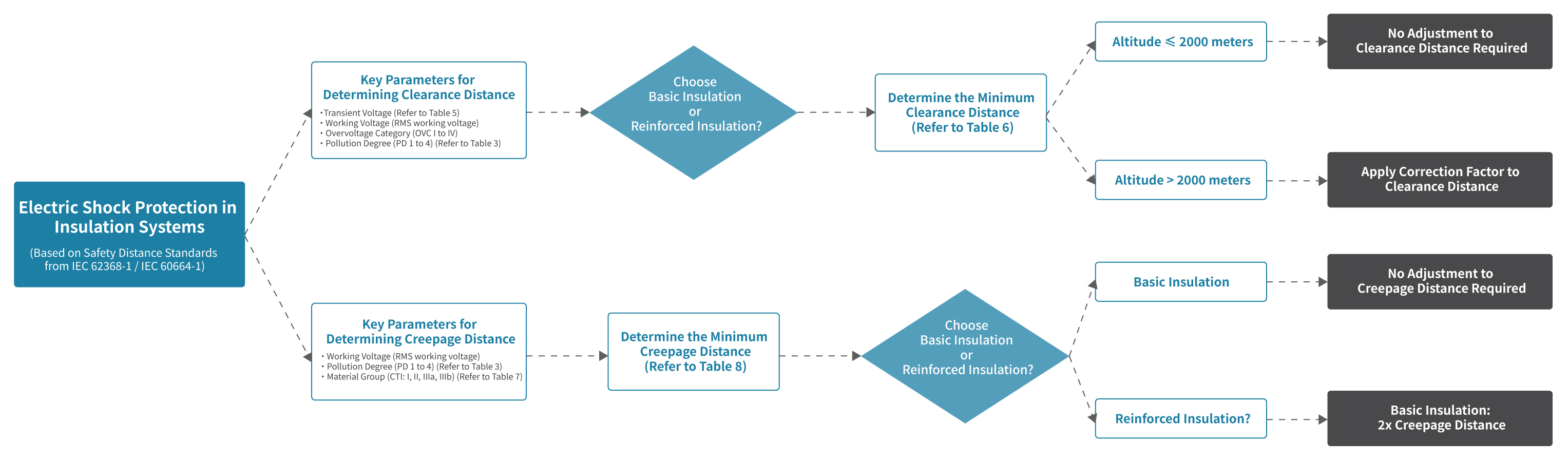 IEC 60664-1 provides the basis for insulation coordination and distance calculation, while IEC 62368-1 applies to the safety of audio/video, IT, and communication equipment. Use both in tandem, depending on product type.