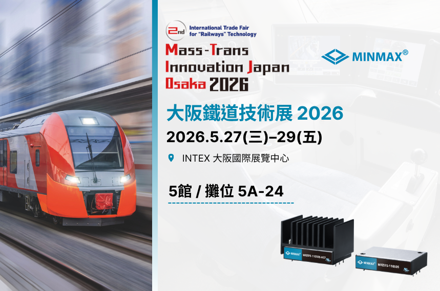 MINMAX 將於 2026 年 5 月 27 日至 29 日,參加在日本大阪 INTEX OSAKA 舉辦的 Mass-Trans Innovation Japan Osaka 2026(MTIJ 2026)。MTIJ 為聚焦鐵道技術的重要專業展會,本屆展會將於大阪舉行。MINMAX 誠摯邀請您蒞臨 5 號館 / 攤位 5A-24,與我們一同交流鐵道與工業電源設計的最新趨勢與應用需求。